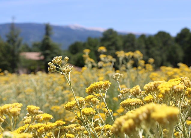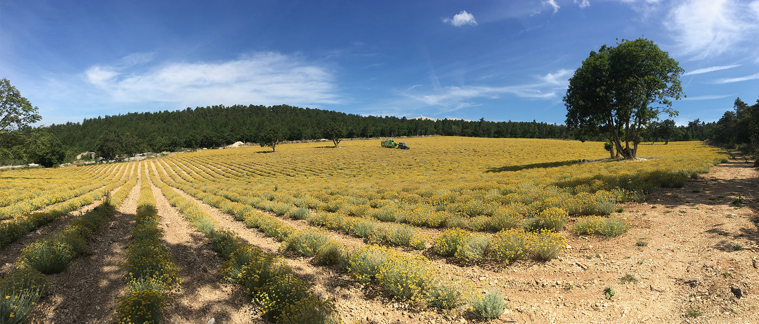 Notre famille se transmet la passion de la terre depuis 8 générations. L'exploitation est une structure de taille moyenne pour la région, avec plusieurs cultures, essentiellement la culture de la vigne et l'arboriculture. Elle est située à Flassan, un agréable village vauclusien accroché aux flancs du Mont Ventoux. Aujourd'hui, une surface d'environ 20 hectares est consacrée à la culture de plantes aromatiques et médicinales : principalement l'hélichryse, mais également le thym à thujanol, le romarin à verbénone et la marjolaine à coquilles.